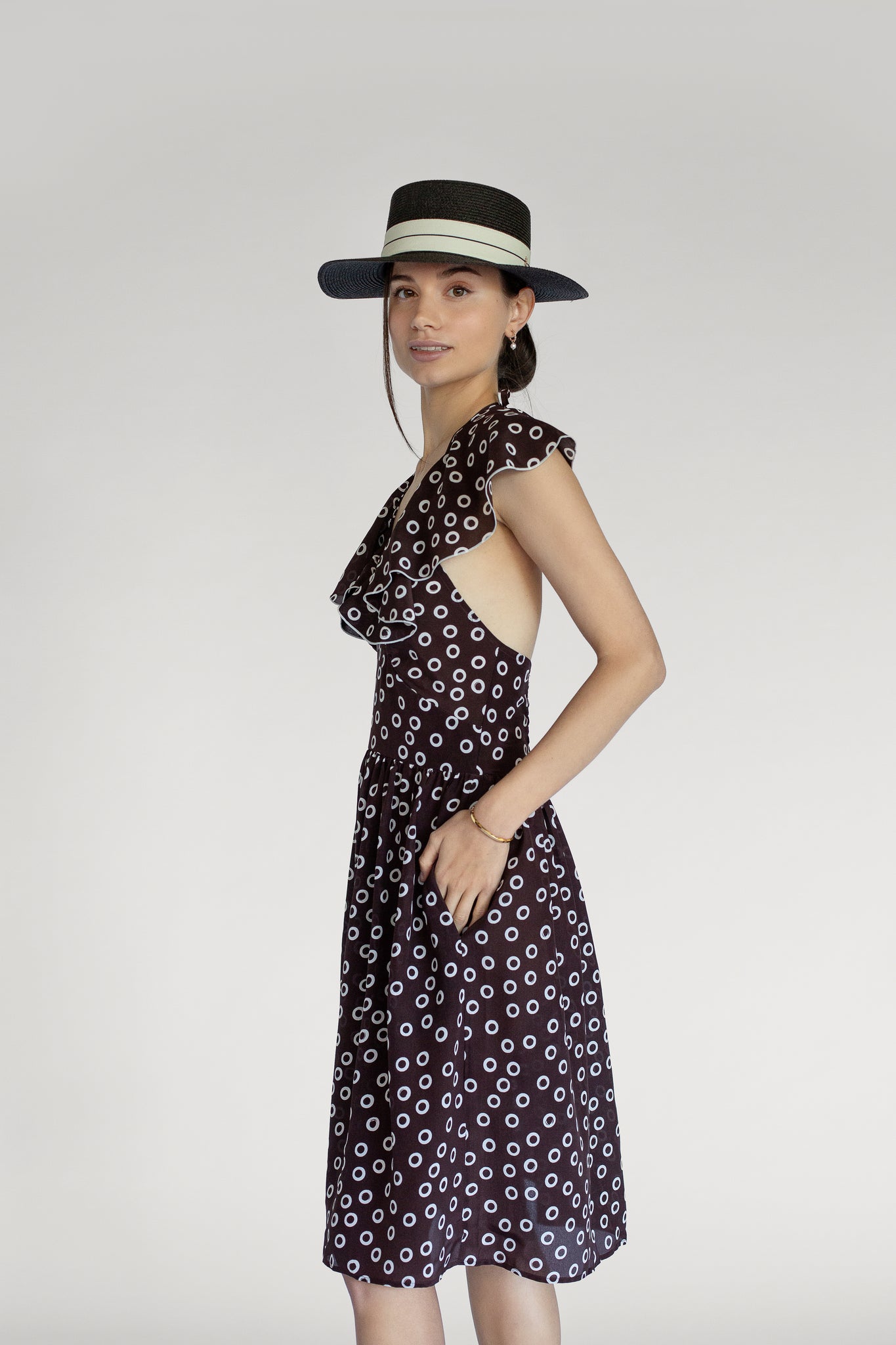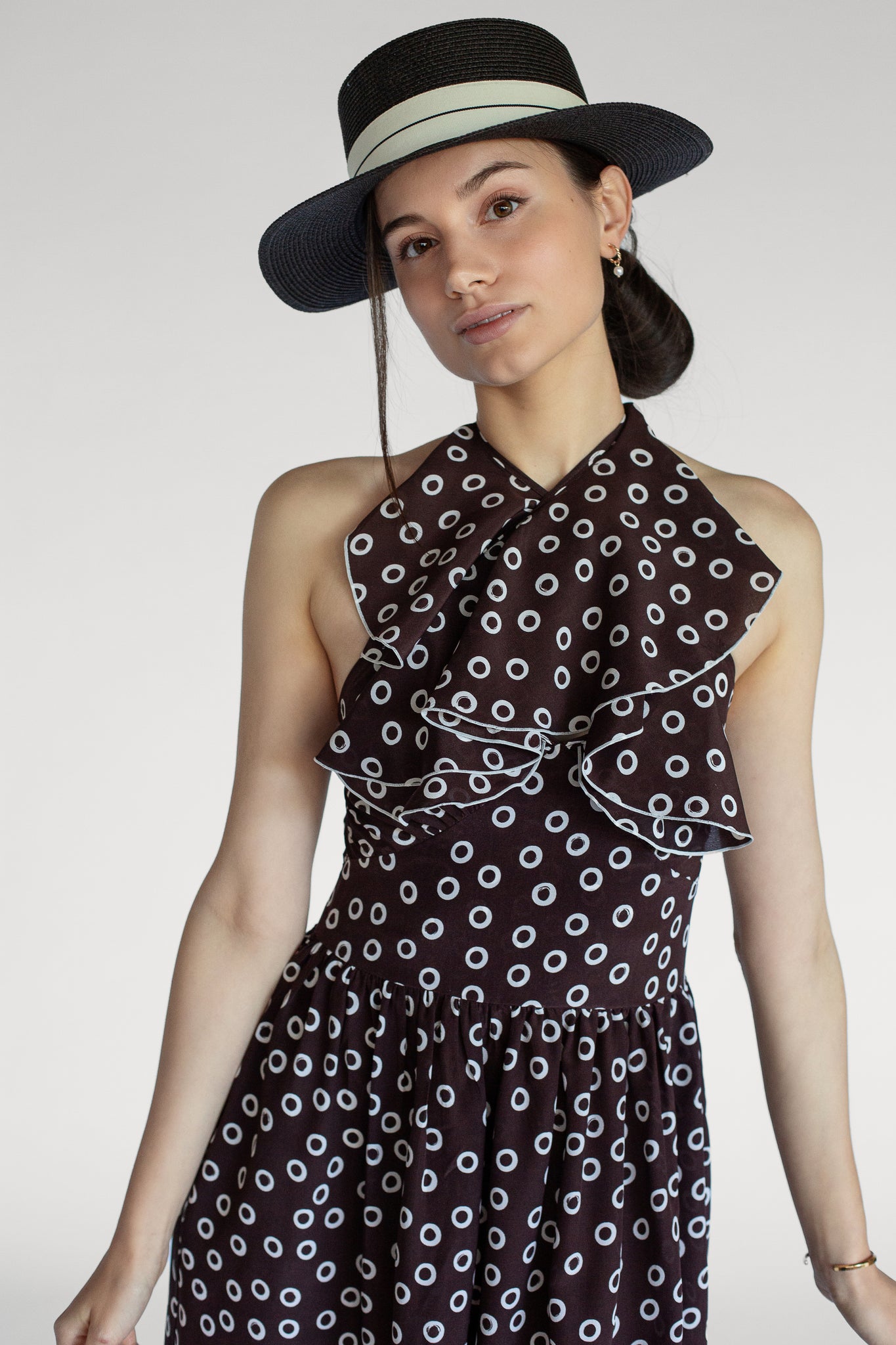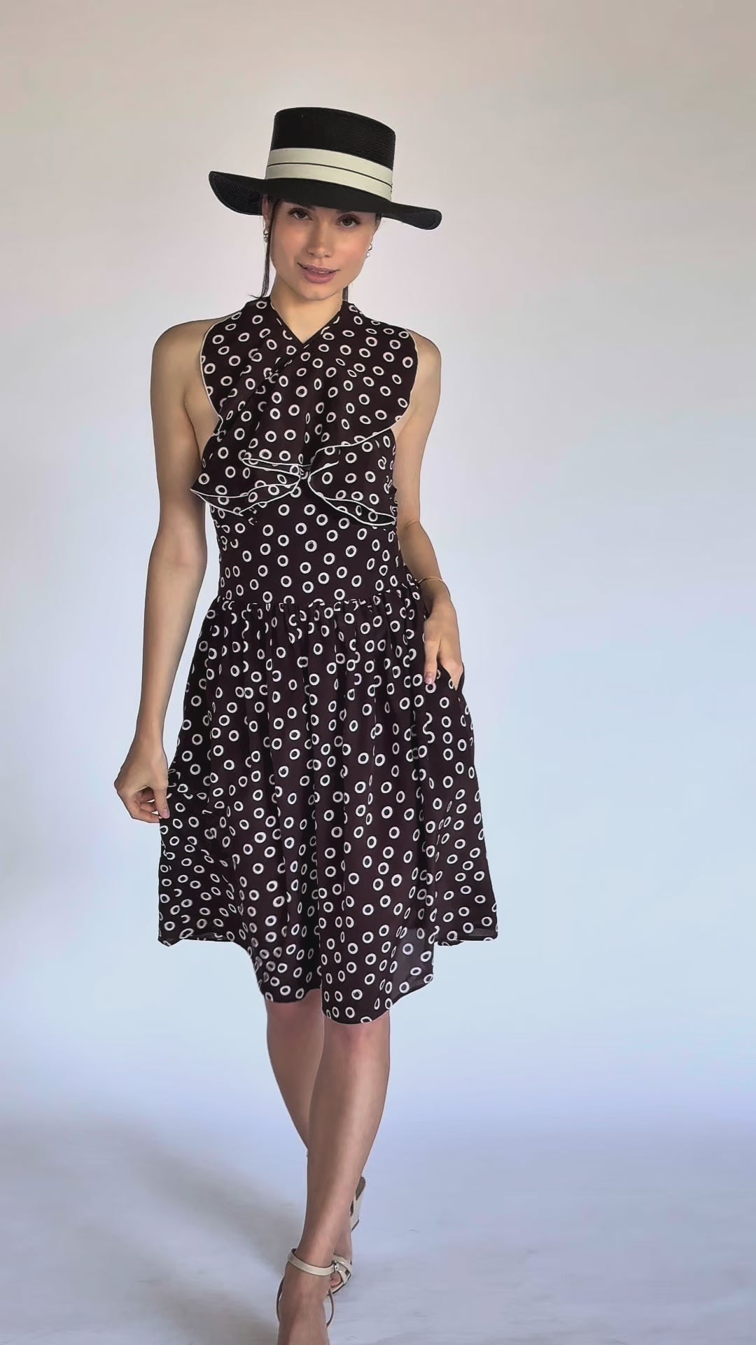 The Colette dress features a playful polka dot print and a soft ruffle neckline that ties two different ways at the front — for a deeper V or a higher halter look.