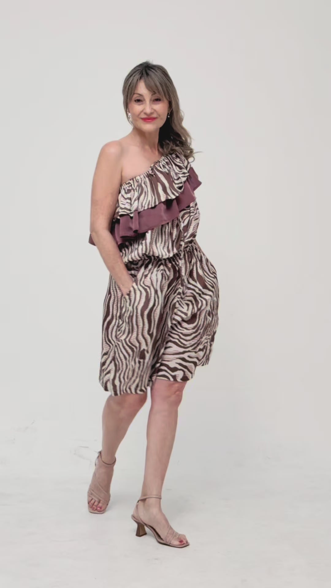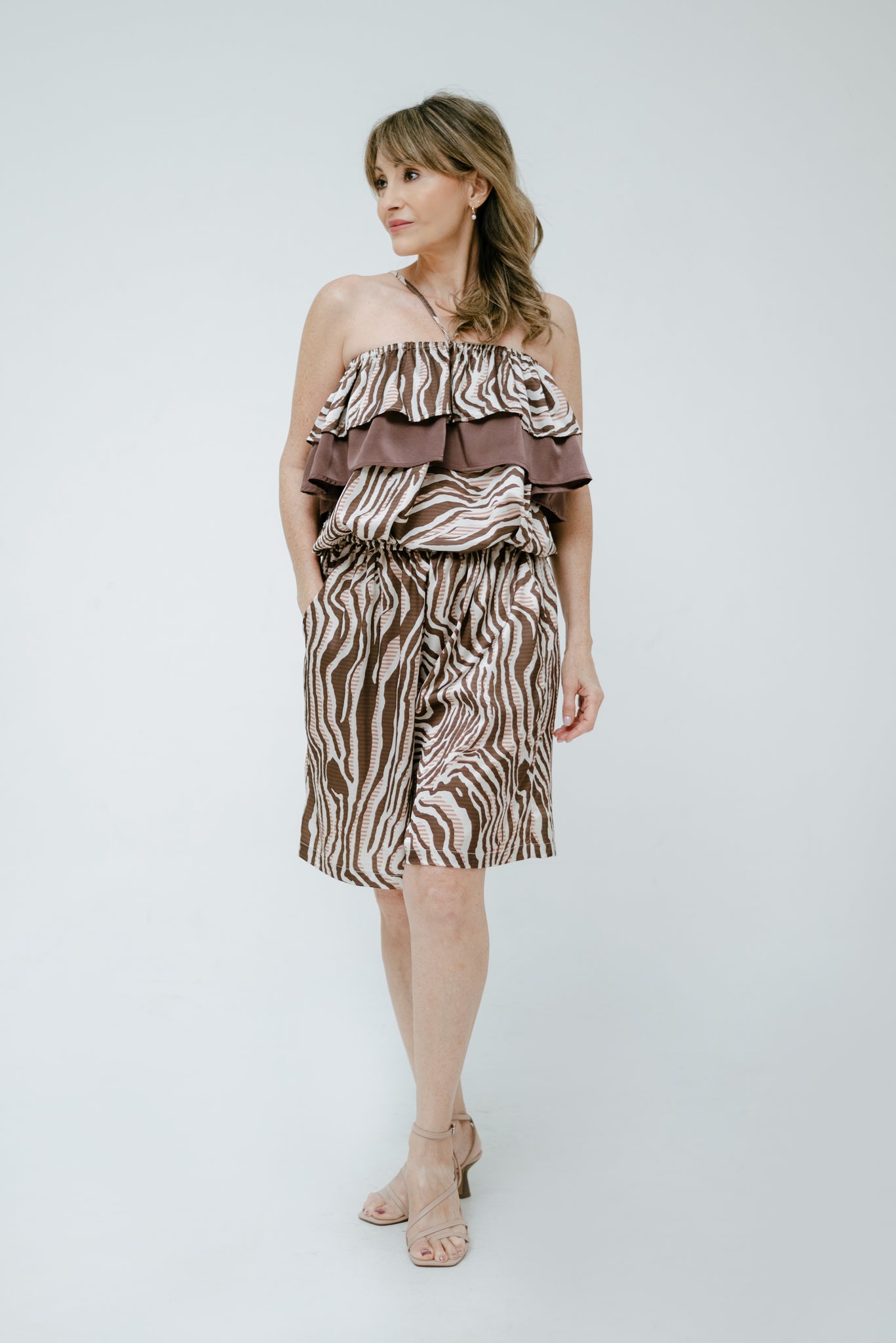 A statement- making jumpsuit in earthy zebra tones with playful layered frills for a contrast look.