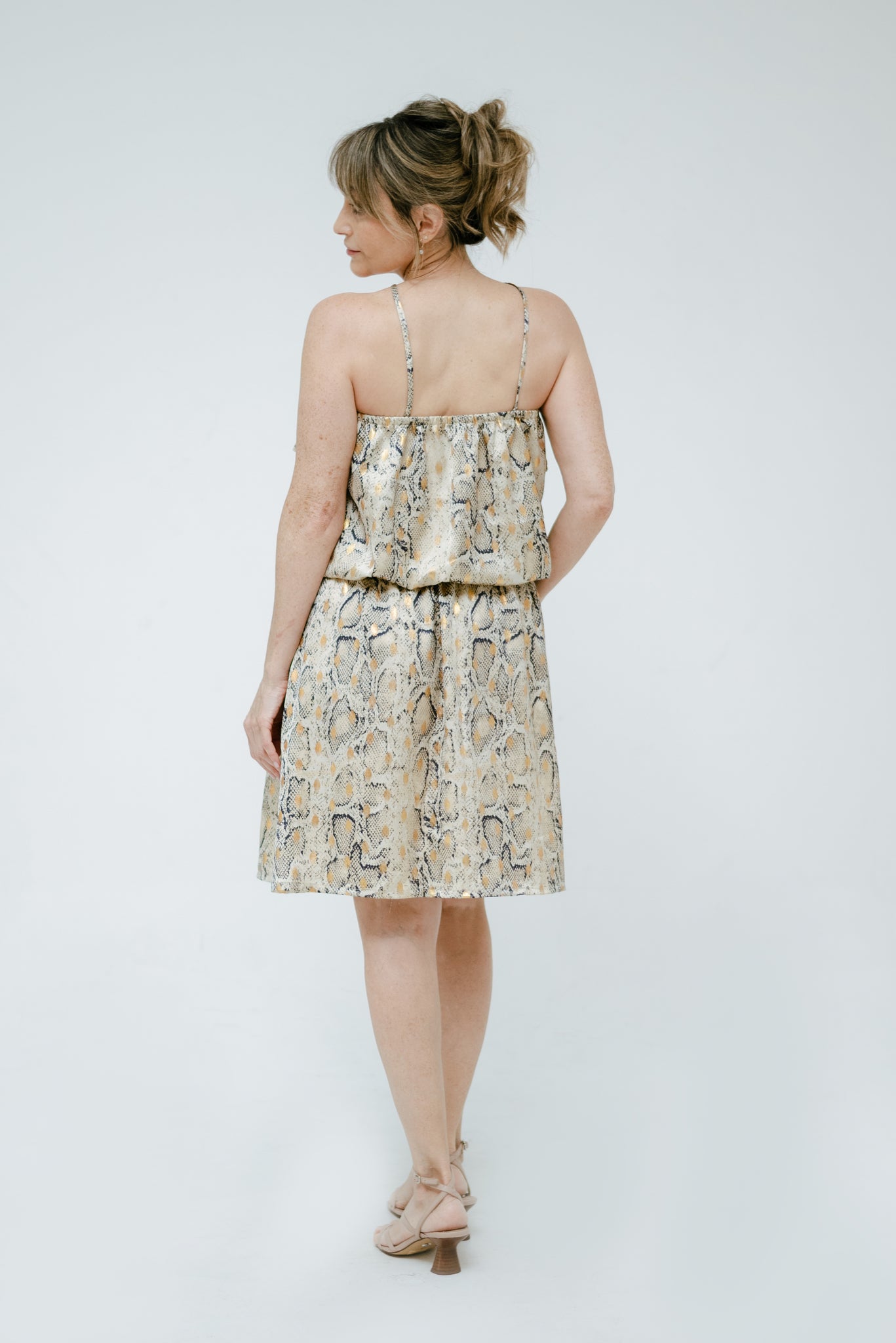 A striking snake-print dress with a soft ruffle neckline and an elastic waist for a flattering fit.